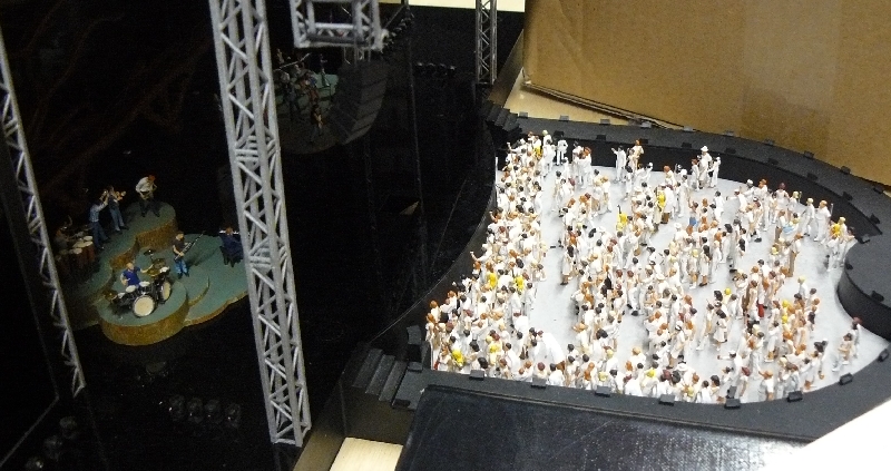 Vorweg: Da ist richtig was los (im 3. Boden, direkt an der Treppe). Die (Standard-)Preiserlein werden salatschüsselweise feil gehalten. JEDER Besucher, der vorbeikommt (also alle) wird freundlich angesprochen, die Aktion wird erklärt, und die meisten wollen dann ein Ticket. 3 Meter gangabwärts steht ein Tisch für die ganz Unerschrockenen, die Ihren Preiser selbst bemalen wollen. Sooft ich an der Stelle vorbei kam, es war IMMER Betrieb. Das 1:87-Stadion (das im Hausgebrauch fast nur noch Helene-Fischer-Stadion genannt wird), hat im Innenraum Platz für knapp 4 Modellbauer (1:1), die den lieben langen Tag nur Püppchen ankleben. Nicht versiegend der Strom von neuen Konzert-Gästchen, die in Halbliter-Plastikbechern ständig nachgereicht werden.