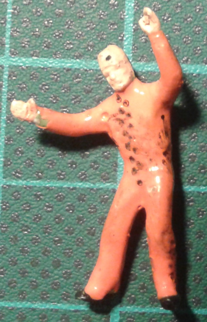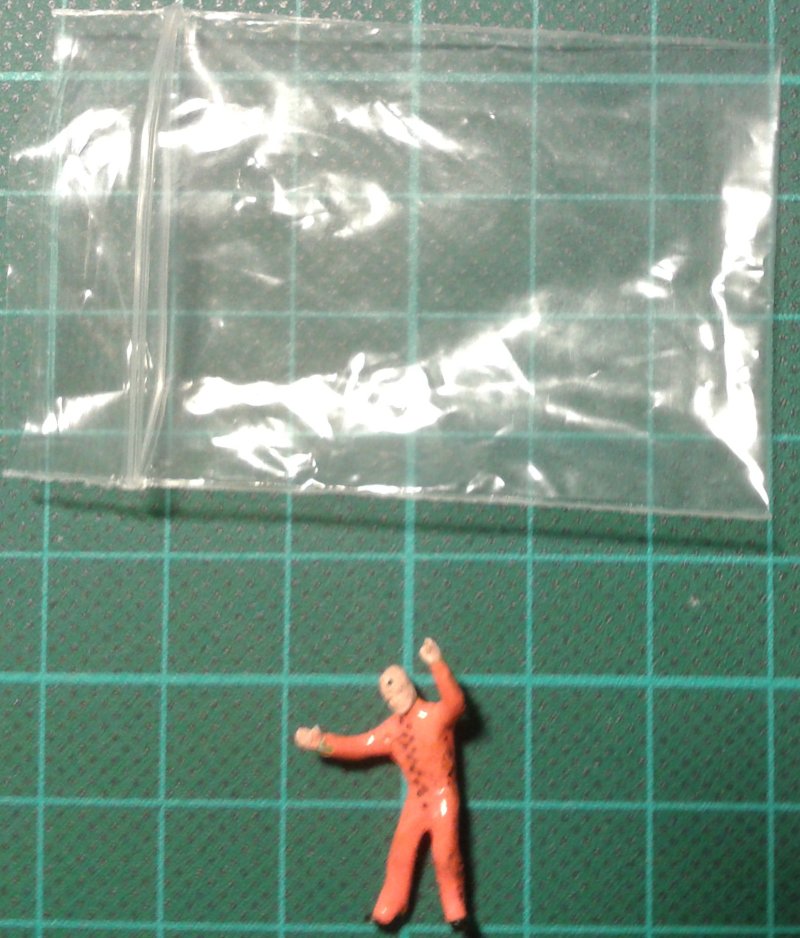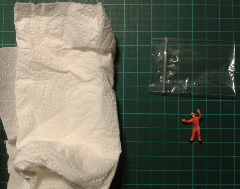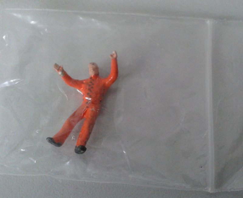 Der Preiser-Dummy im leuchtend roten Overall kam, nach Bergung der wertvollen, weil handgearbeiteten, Figur in die Passform und diese dann wieder in den originalen Papp-Umschlag. Damit war der Urzustand der Sendung wieder hergestellt.