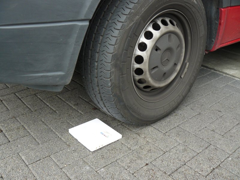 Unser geschultes Personal ordnete die Versuchskomponenten derart an, dass die Verpackung mit dem Dummy von einem LKW (Mercedes-Benz „Sprinter“, Zul. Ges.-Gew. 3,5 t) zweimal überrollt wurde. Das Reifenprofil bzw. die Struktur der Pflastersteine waren danach deutlich in die Umverpackung eingeprägt. Innenseitig hatte sich der Holzrahmen ebenfalls deutlich in die Pappe gedrückt. Der Dummy war jedoch vollkommen unversehrt. Damit konnte er für den nächsten Test recycelt werden. *** Fortsetzung folgt ***
