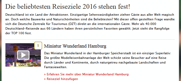 Jedes Jahr wählt die Deutschen Zentrale für Tourismus e.V. die Top 100 Sehenswürdigkeiten in Deutschland. Wer hat Lust uns helfen? Einfach diesen Link klicken und das Miniatur Wunderland in das Feld dafür eintragen: