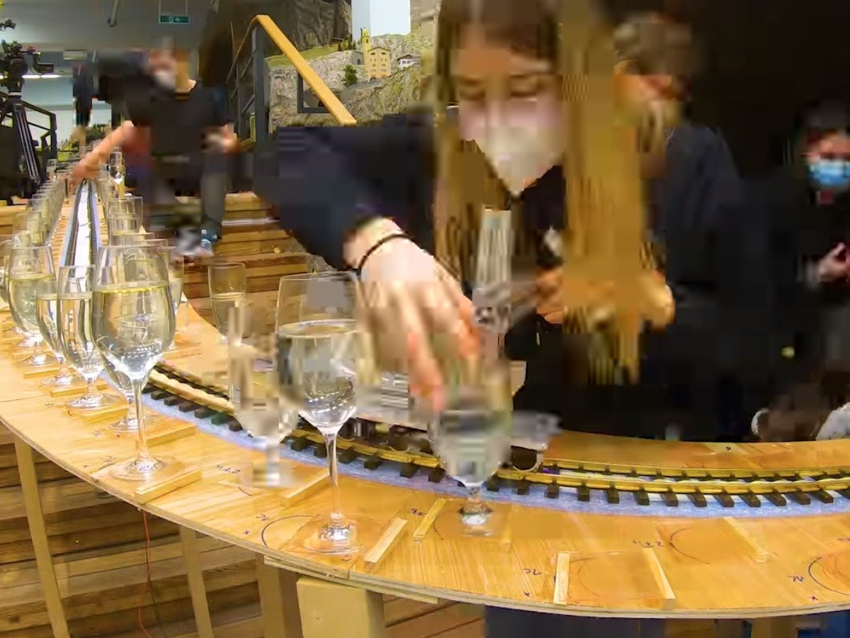 Ich bin auf etwa 80 Gläser in Sekunde 5 bis Sekunde 15 des Videos gekommen. Das ergibt 8 Gläser pro Sekunde und damit zwischen Minute 0:04 und Minute 5:55 (351 Sekunden) in Summe rund 2.800 Gläser, falls mein Intervall repräsentativ ist. Wenn jedes Glas mit im Schnitt 0,2l Wasser gefüllt ist, wären das insgesamt 560l Wasser, was knapp 0,02 Nord-Ostseen entspricht.