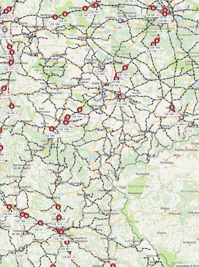 Also so ganz scheint die oben geäußerte Vermutung dann doch nicht zu zu treffen, wie man vor etwa 1 Stunde gut erkennen konnte. Die Verspätungen auf der recht neuen Strecke haben sich dem bundesweiten Chaos der Bahn langsam angepasst: