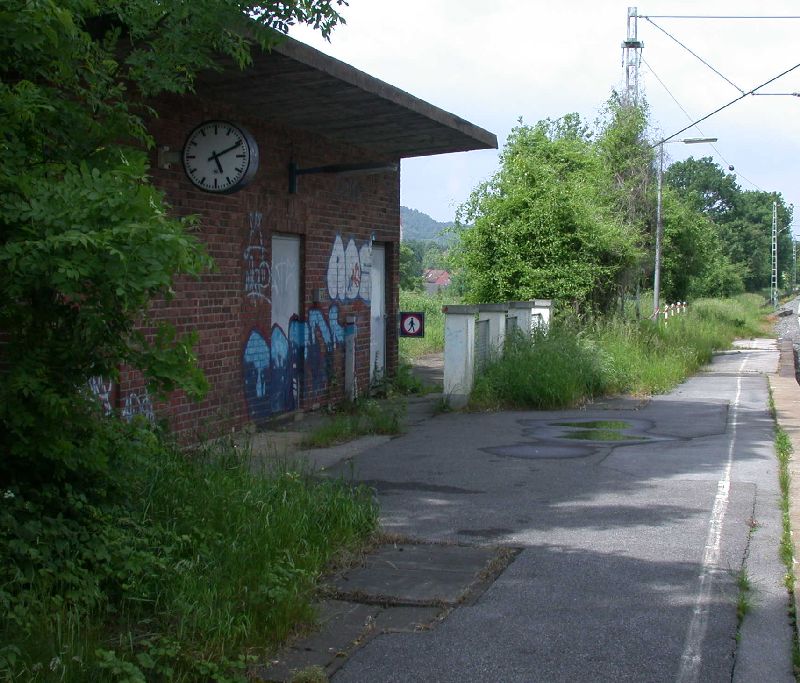 Die Uhr steht auf etwa 12 nach 5, ich leiste aber einen Eid darauf, dass das Bild um 5 vor 12 aufgenommen wurde. Offenbar halten dort schon länger keine Züge mehr.