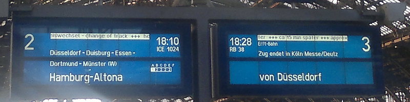 hat hier niemand mehr einen Bahnhof? Oder keine Rätselkreationsmotivation?Ich wüsste gerne die Nummer des ICE auf der linken Anzeigetafel in Binärdarstellung. (Die Frage nach dem Bahnhof ist damit ja eindeutig beantwortet.)