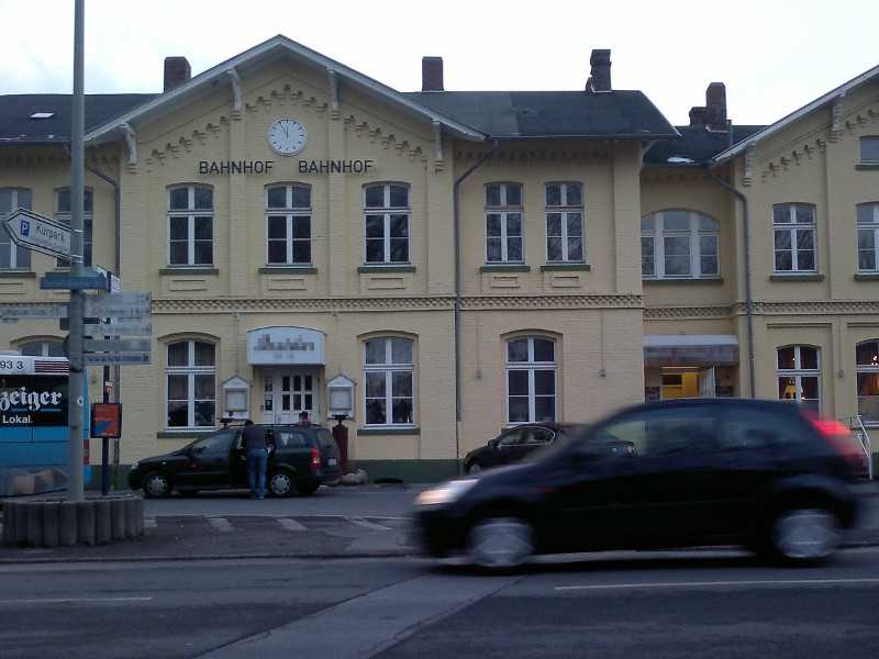 hat denn niemand mehr einen vorzeigbaren Bahnhof? Den hier könnte ich noch anbieten:Leider war meine Kamera so betrunken, dass sie einen Teil des Schriftzugs doppelt gesehen hat.