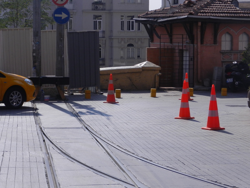 Auf dem Foto ist der westliche Endpunkt der Linie T5 zu sehen. Es handelt sich bei dieser Linie um eine abgeschlossene Strecke, die vom Taksim Platz die İstiklal Caddesi an der Station der historischen Standseilbahn (Tünel) endet. Dort steht auch der Prellbock.
