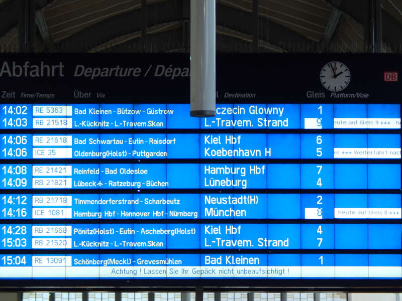 (Den Rest kann jeder selbst raussuchen: 14:03 Uhr RB nach Lübeck Travemünde Strand aus Gleis 8 und 14:16 ICE nach München Hbf aus Gleis 9)Das Foto entstand allerdings nicht an einem Sonntag, sondern am Donnerstag, 26.12.2013 (2. Weihnachtsfeiertag).