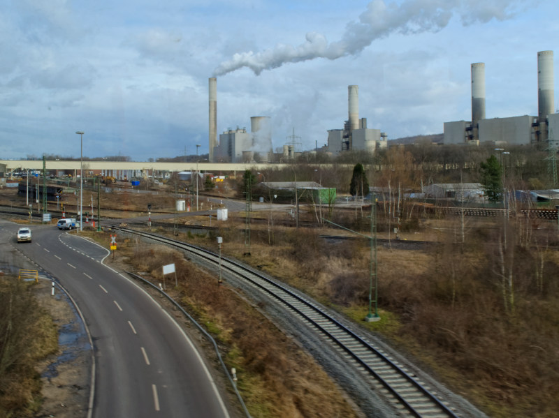 Braunkohlekraftwerk, dessen letzte beiden Blöcke sich 2018 das 'Rauchen' abgewöhnen müssen, kann man gut sehen, wenn man mit der Reginalbahn von Bedburg (Erft) nach Grevenbroich fährt. Dabei entstand auch dieses Foto, wie man an ganz leichten Spiegelungen sieht.
