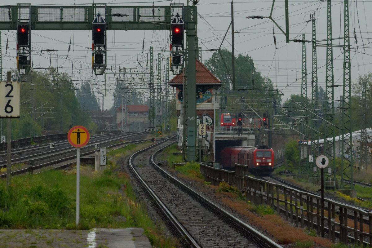 Blickrichtung Süd-Süd-Ost. Das zweite Stellwerk steht hier, am nächsten Bahnhof (Magdeburg SKET Industriepark), etwa 1,3km hinter dem Bahnsteigende von Buckau.
