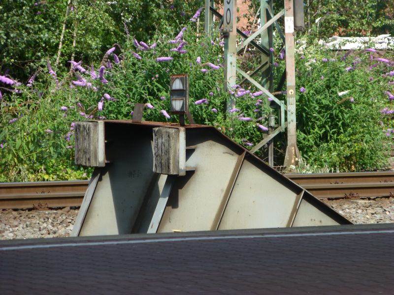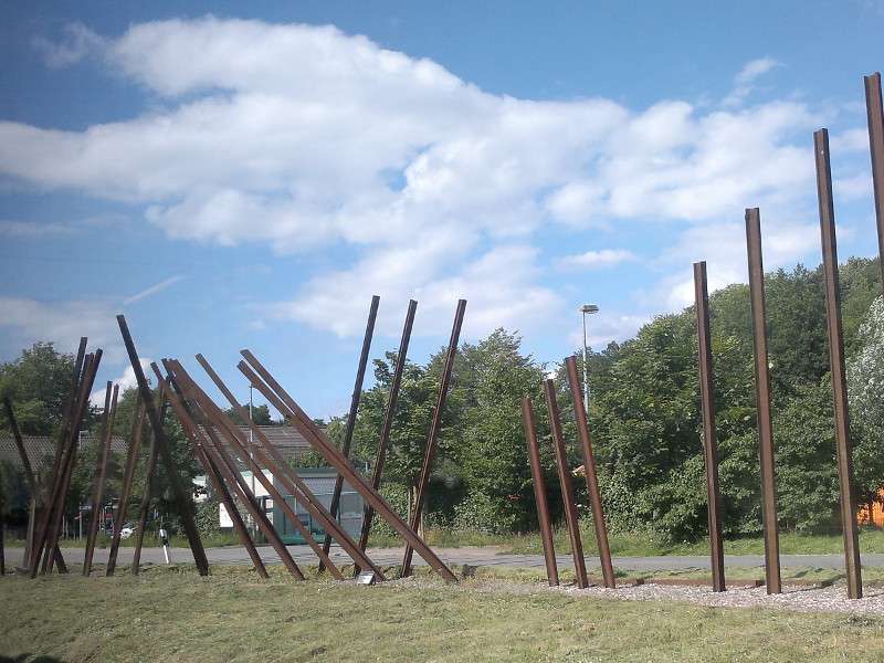bei dem folgenden Bild fragt man sich vielleicht, ob die Einwohner dieses Ortes den Zorn des Schienengottes zu spüren bekommen haben, oder ob sie mit diesem Bauwerk selbst die bösen Geister der Entgleisungen vertreiben wollten.Wo steht dieses merkwürdige "Kunstwerk"?