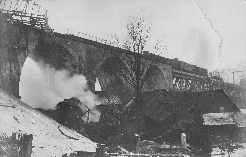 Hm, also die Dampflok hat Bernd ja bestätigt. Das Portal ist mir auch aufgefallen, aber es ist weit und breit kein Fahrdraht zu sehen. (Und von dem Baum sieht man Zweige, die deutlich dünner als ein Fahrdraht sein dürften, an der Fotoqualität liegt es also vermutlich nicht.) Für eine Munitionsexplosion erscheint mir die Brücke etwas zu intakt, aber das kann natürlich täuschen, oder die starken Brückenschäden liegen links des Bildausschnittes...