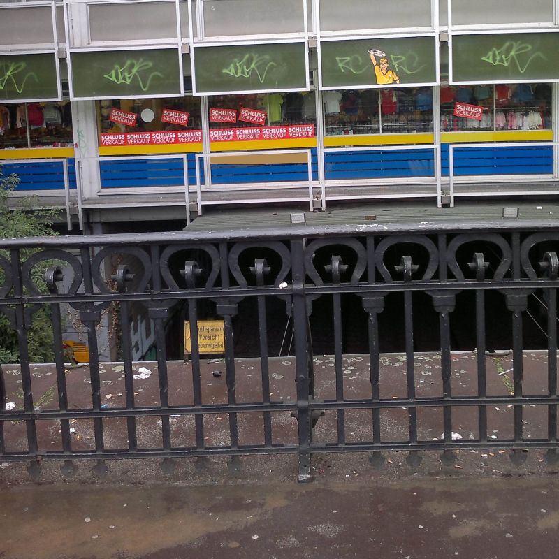 hier mal ein Ausschnitt einer Brücke, zu der parallel ein Geschäfts- und Bürogebäude die Schienen überspannt:Welche Strasse überquert hier die Gleise und was fährt auf den Gleisen?