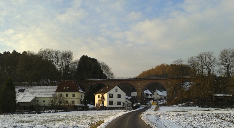 Von den letzten Strahlen der winterlichen Nachmittagssonne beschienen sehen wir eine Ortschaft, die sich unter den Viadukt duckt.