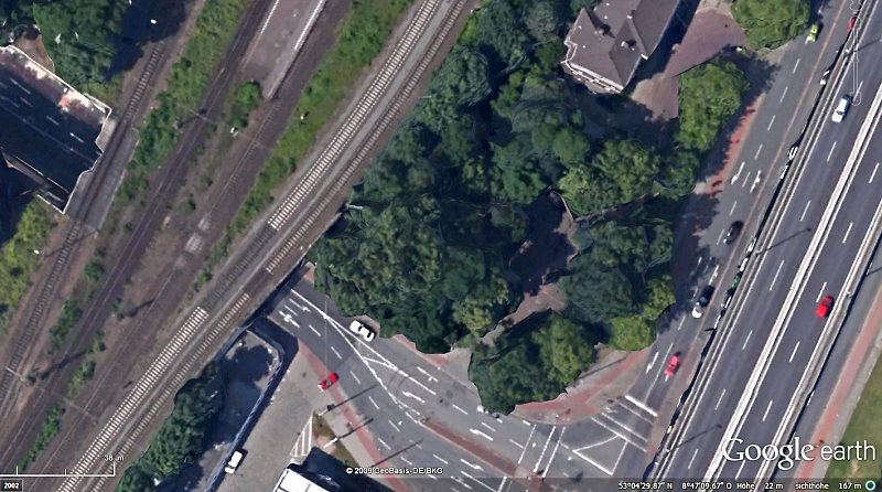 Da bleibt nur "Hansestadt Bremen" übrig, und da das ein verhältnismäßig kleines Dingens ist, kann es vermutlich dort nur (Vordergrund) "Am Hohentorsplatz" sein mit Blick auf die "Woltmershauser Straße" - aufgenommen vermutlich aus einem Auto auf der B6 (überbrückt den Platz). Demnach komme ich auf fünf Gleise, die die Straße überbrücken - zumindest war das im Jahre 2009 der Fall.