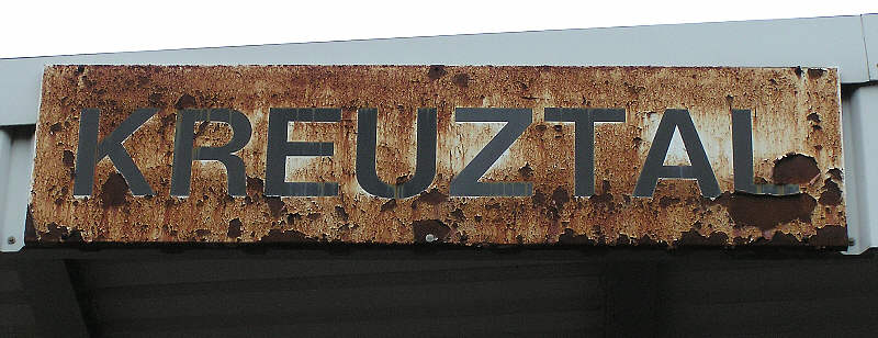 Der Hektometerstein war nicht am Computer bearbeitet, genau wie dieses Bahnhofsschild: Es wurde auch ohne Computer lange nicht bearbeitet. Meine Fotos sind von 2005 und in Kreuztal wurden zwischenzeitlich zumindest die Bahnsteige erneuert (das Schild könnte also auch schon Geschichte sein).