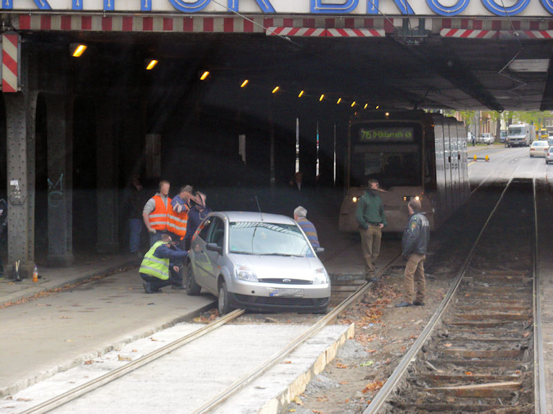 welche Straße verläuft unter dieser Eisenbahnbrücke. Damit es nicht zu schwer wird, habe ich die Zielanzeige der Strab unverändert gelassen.