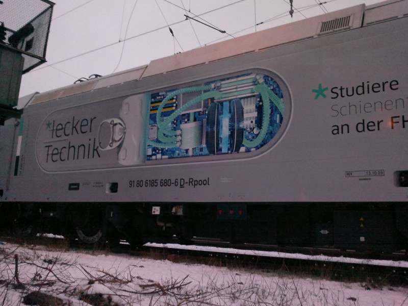 Die FH Aachen nutzt die Lok als Blickfang und Publikumsmagnet für die Eigenwerbung.