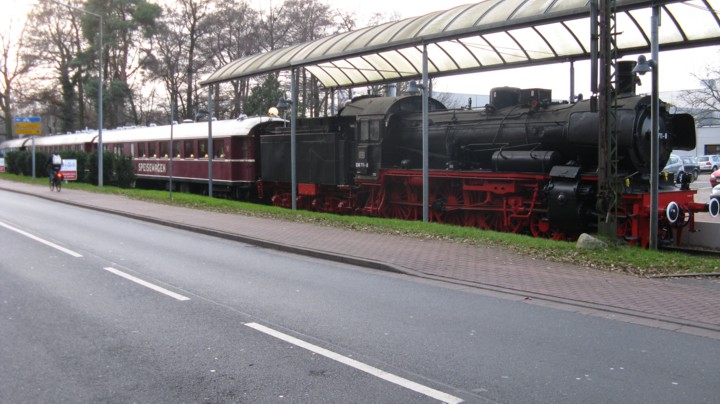 Er schreibt: "Zwischen Hannover und Nienburg ist die 038 711 mit zwei Speisewagen und einem 3achsigen Umbauwagen ausgestellt. In den Speisewagen war sonst immer ein Restaurant untergebracht. Momentan stehen die Wagen leer."