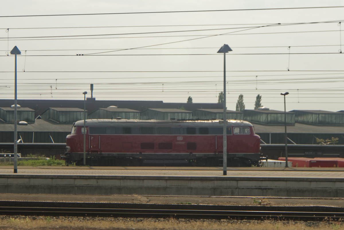 Es ist die V160 002, auch bekannt als 216 002-6. Im August 2018 im Oldenburger Hauptbahnhof (Niedersachsen) fotografiert.
