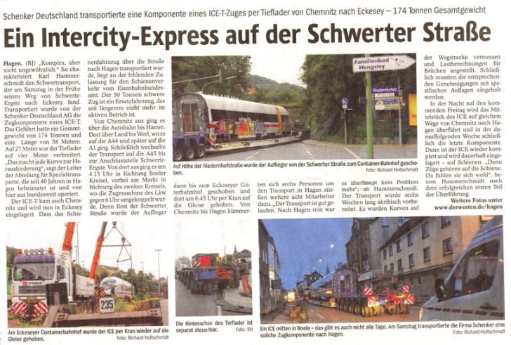 Vor allem: Warum sollte man den ICE-TD, der er recht sicher ist, und der schon lange nicht mehr gefahren ist (nicht die Baureihe, sondern der transportierte Zug), in Hagen staht in Chemnitz einlagern? Und ohne Zulassung? Sogar die Donald-Duck-ET 403 durften noch gezogen werden und die fahren ja seit bald 20 Jahern nicht mehr.