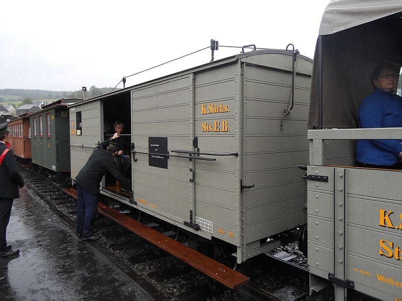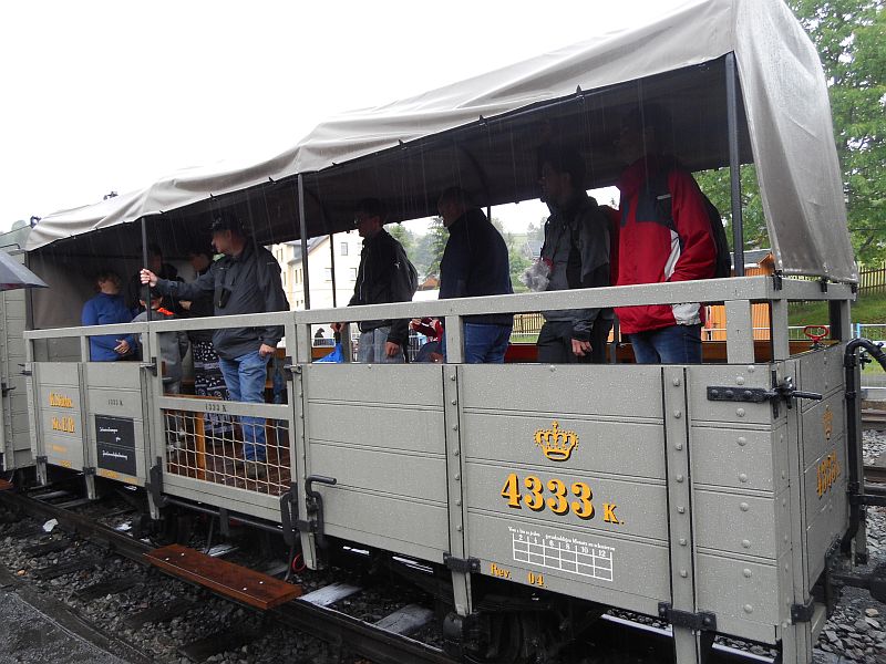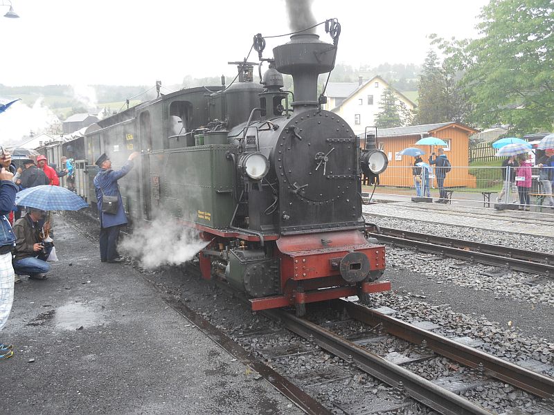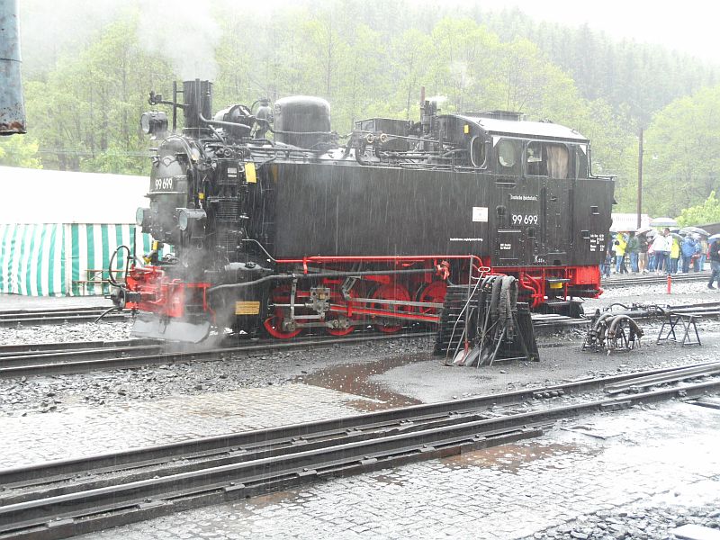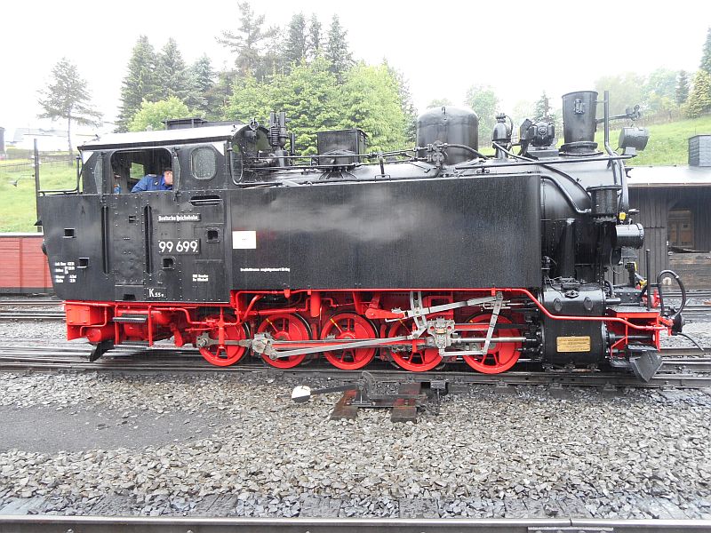 Natürlich warteten die Loks mit ihren Waggons auf ihre Fahrgäste um die Strecke von Jöhstadt nach Steinbach und zurückin Angriff zu nehmen. Also Fahrkarte kaufenund rein in den Zug. Mit Glück konnte man einen Sitzplatz erwischen, da die Züge immer voll waren.Allerdings war dieser Ortvorsichtshalber geschlossen, um dem frischen Gleisschotter die Verschmutzung zu ersparen.