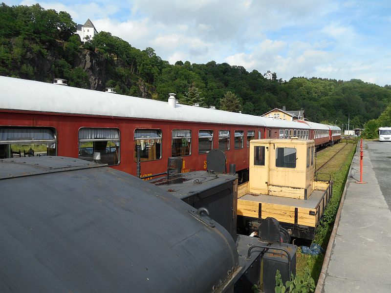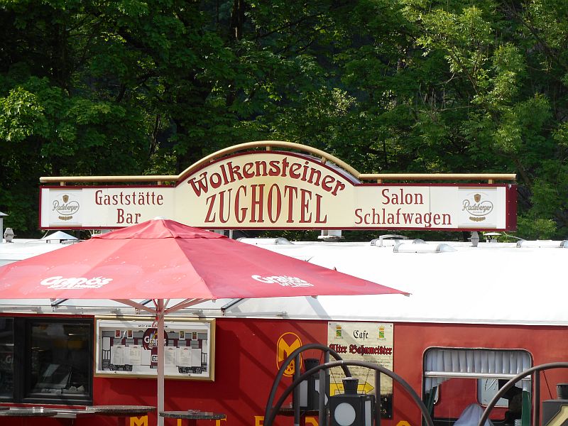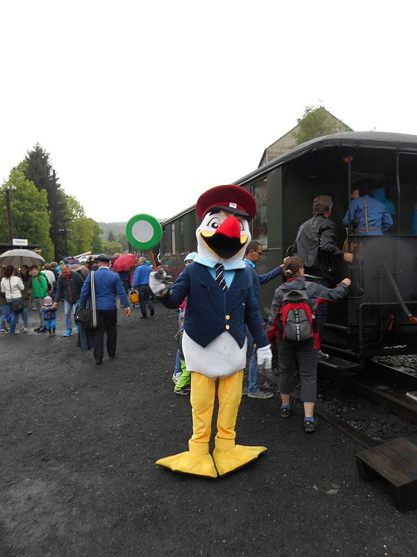 Natürlich war auch das Maskottchen vertreten, das sich für mich extra in Positur gestellt hat. Und ganz zum Schluss noch ein Blick auf den Bahnhof Wolkenstein, der vor dem Abriss der Strecke der Ausgangspunkt der Preßnitztalbahn war und das dort stehende Zughotel. In der Ausstellungs- und Fahrzeughalle waren einige Modellbahnanlagen aufgebaut. Ein paar Bilder davon sind hier zu sehen.