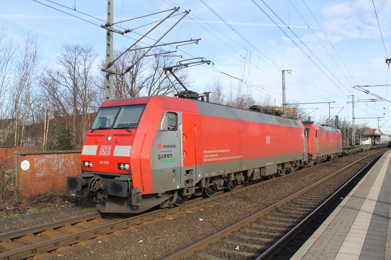 Das zweite Bild zeigt wieder die EG 3103 letzte Woche Samstag, am 03.03.2012, wieder in Neumünster und ebenfalls bei einer Durchfahrt über Gleis 5. Sie trägt nun die Lackierung der DB Schenker Rail Skandinavia. Dahinter eine BR 185 in der gleichen Lackierung.
