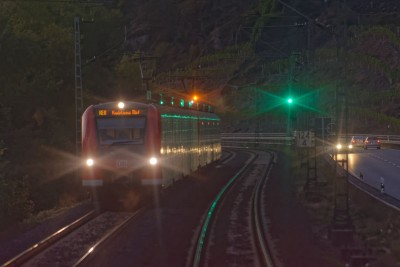 Begegnung des RE8 auf der rechten Reheinstrecke, Kilometer 124,4, kurz vor Rheinbrohl, vom RE8 in Richtung Köln aus aufgenommen: