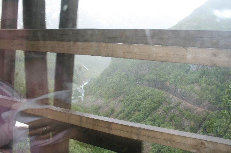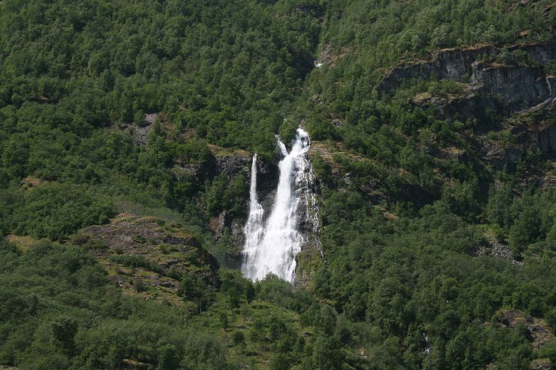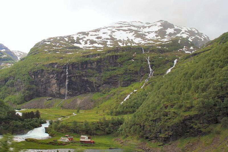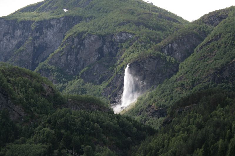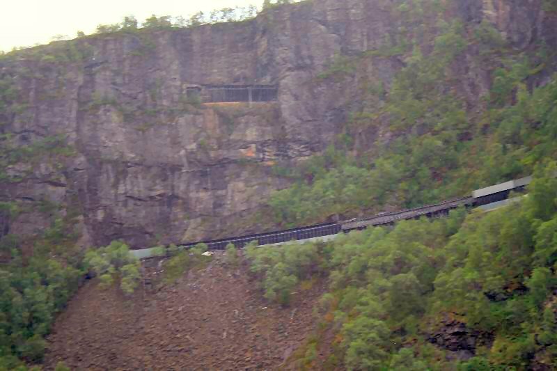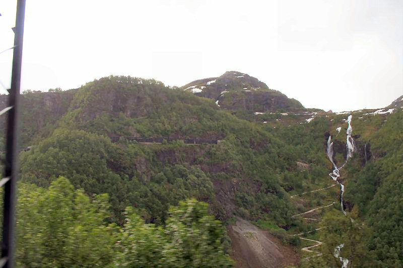 Rechts oben auf dem Plateau ist die Endstation der Flåmsbahn, Myrdal, 864 m über dem Ausgangspunkt und damit 866 über dem Meeresspiegel. davir die zum Bau der Bahn angelegte Serpentinenstrasse. Auf der linken Seite erkennt man auf halber Höhe die im Berg angelegte Strecke, es folgt ein Kehrtunnel und noch einmal eine kurze Galerie.