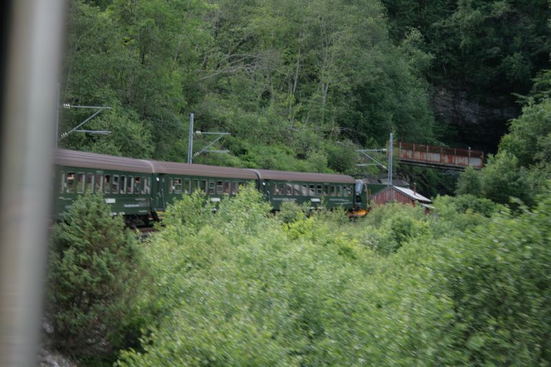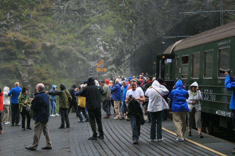 Entgegen vieler Informationen in diversen Foren war es überhaupt kein Problem, morgens Fahrkarten zu bekommen, wir haben den Zug um 12:20 genommen. Der Einstieg ist super organisiert, für die aussteigenden Fahrgäste wird ein Teil des Bahnsteigs abgesperrt, für Rollstuhlfahrer existiert eine sehr komfortable Rampe. Kaum geht die Fahrt los fährt man sofort an zahllosen Wasserfällen vorbei, der Zug windet sich über enge Kurven die bereits 1923 begonne Strecke mit einer Steigung bis zu 5,5 % im reinen Adhäsionsbetrieb hinauf.