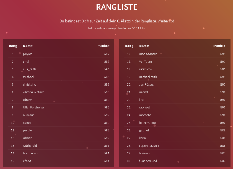 Eher war ich letztes Jahr frustriert... als sich Mitte Dezember abzeichnete, dass es ein "von99auf100Punktezurechtrücken" wurde.