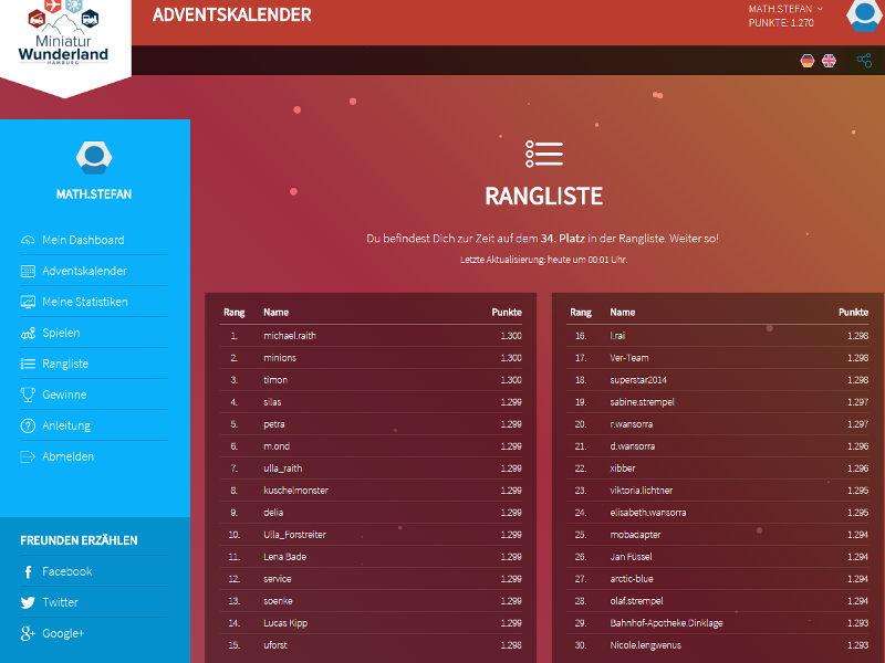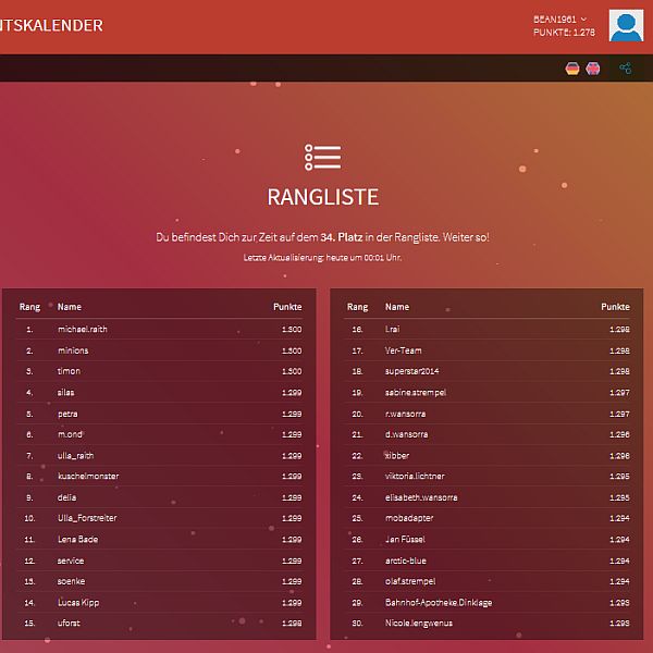 ENDLICH: Ich bin heute auch mal auf dem 34. Platz, mit ganzen 1375 Punkten.