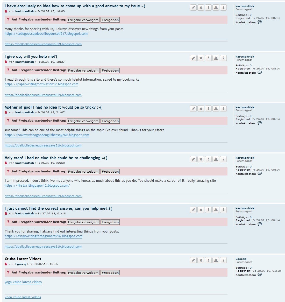 Würden die Beiträge alle so durchgehen, dann hätte unser Forum heute früh so ausgesehen: Also liebe "Erstschreiber": Habt etwas Gedult, Eure Beiträge werden auf jeden Fall freigeschaltet, allerdings nicht 24/7 ...