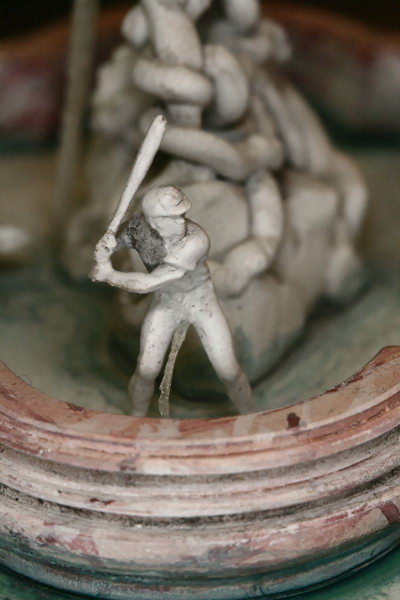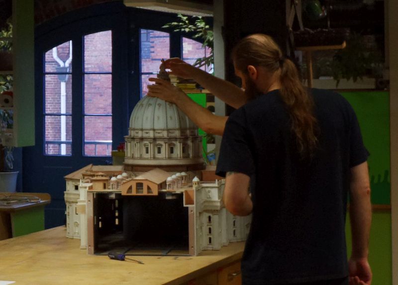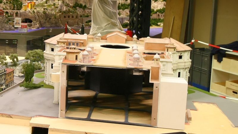 Geschlafen hat der Heilige Peter zwar ziemlich kopflos, aber schon einmal an der richtige Stelle: Gut zu erkennen sind aufgrund des noch fehlenden Eingangs die wegen der Größe des Modells statisch notwendigen Verstrebungen und die Stütze für die große Kuppel.