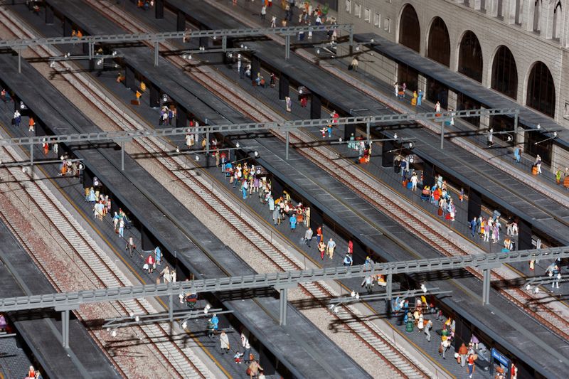 Aber wieder zurück zum Rohbau. Ein einziger Zug fährt, wahrscheinlich extra für die anwesende Presse gechartert, ständig in den Bahnhof und wieder heraus, es sieht aus wie auf einer kleinen Modelleisenbahn, um den Anschein eines kleinen Mindestbetriebs zu wahren. Damit nicht genug, obwohl ich die Bauarbeiter mehrere Stunden beobachtet habe konnte ich keinen nennenswerten Fortschritt feststellen.