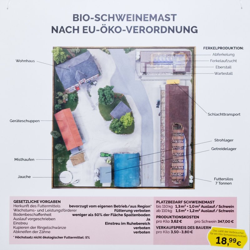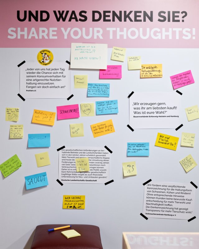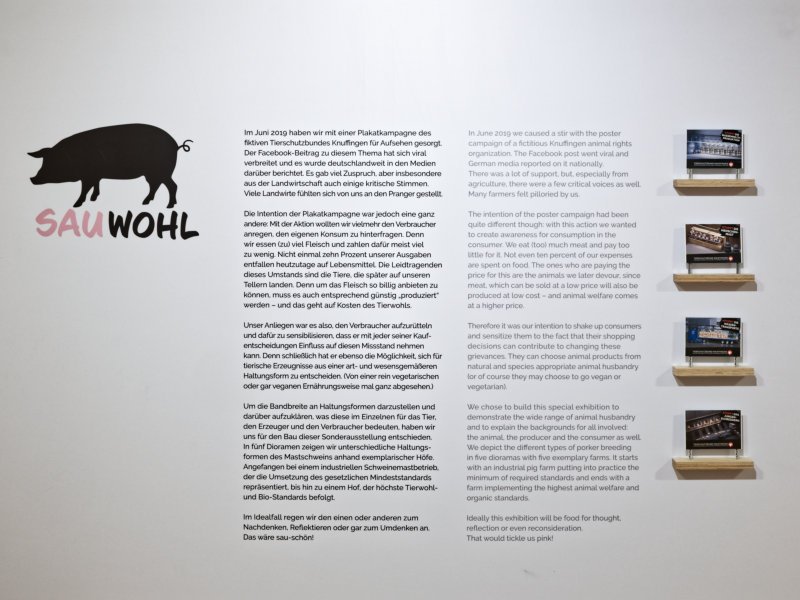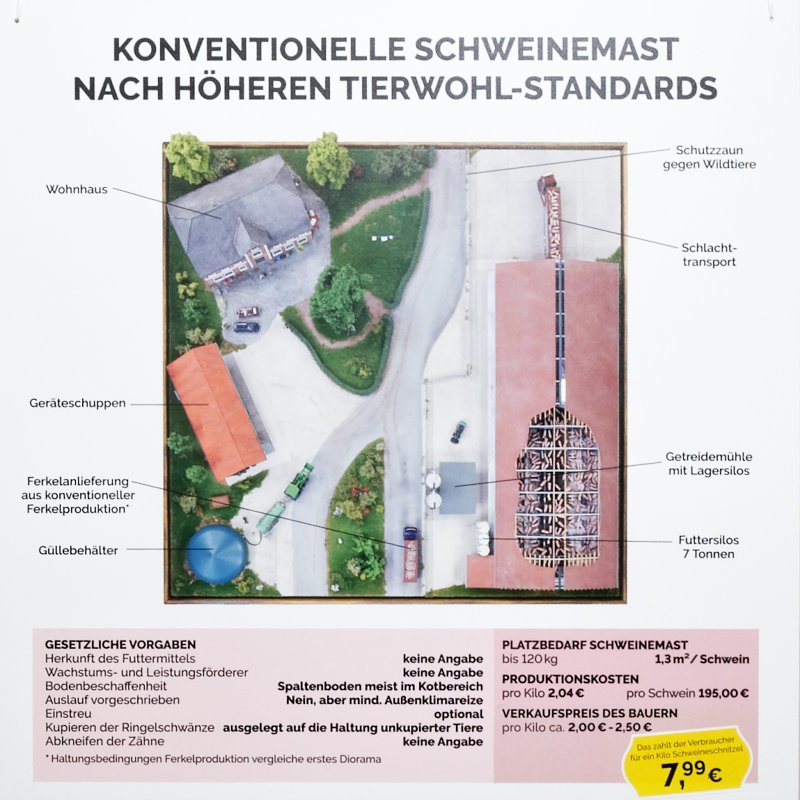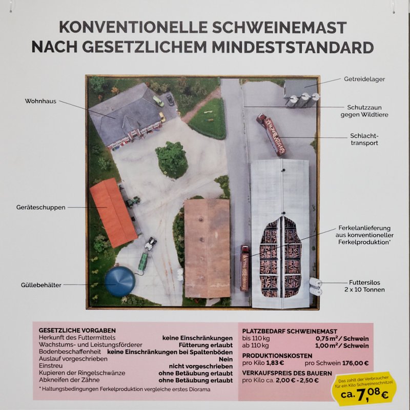 Haltungsform 5: Bio-Schweinemast nach höchsten Tierwohl-Standards:Natürlich gibt es in dieser Sauwohl-Dauerausstellung nicht nur diese fünf liebevoll gemachten Dioramen sondern man hat auch noch ein paar Informationsseiten mit verwurstet:Als Abschreckung wurden einige saumäßig schlechte Angebote verschiedener Supermärkte zu einer Collage geklebt:Wie kam es eigentlich dazu: Die Sau-bere Vorgeschichte des ganzen:Und natürlich darf auch jede Sau ihren Senf dazu geben:Die Kommentare sind - anders als in sozialen Medien - durchweg sehr positiv gegenüber dieser saumäßig gut umgesetzten Darstellung des Sauwohls.