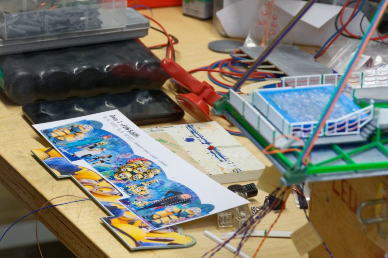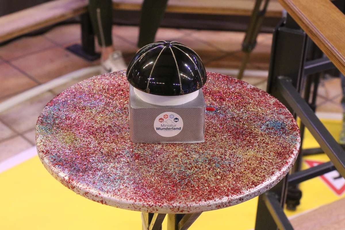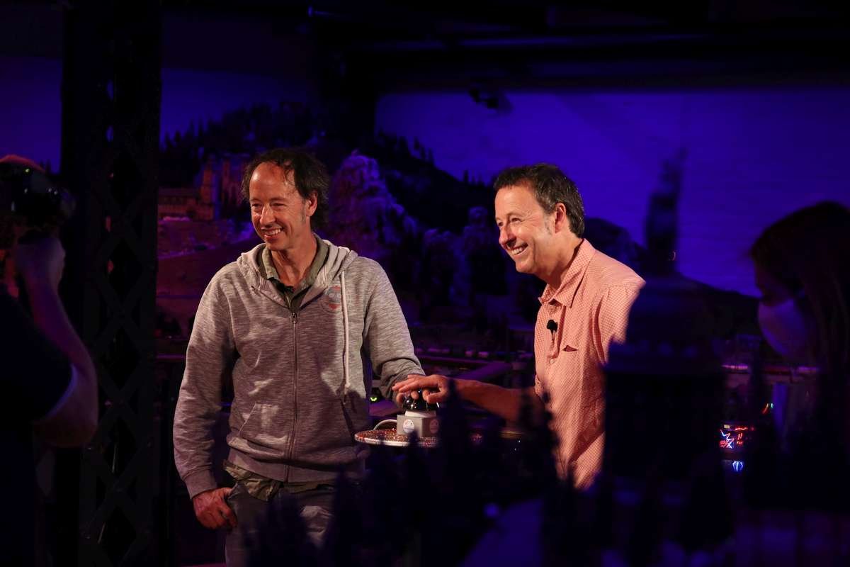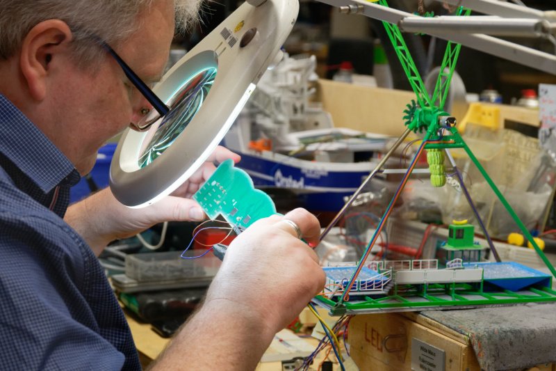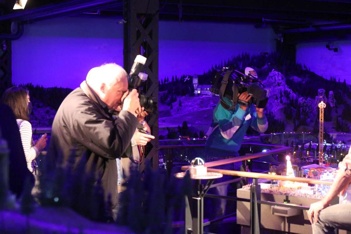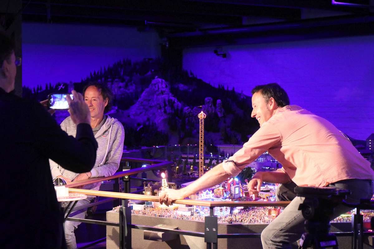 Die Kirmes stellt ein weiteres Highlight in der Ausstellung dar, Freddy und Gerrit waren stundenlang damit beschäftigt, für die Presse auf den eigens noch in der Nacht angefertigten, mit über 400 LEDs beleuchteten Buzzer zu drücken. Natürlich erst, nachdem die ein oder andere Last-Minute-Reparatur durchgeführt wurde. Durch Scheinwerfer ins rechte Licht gerückt haben sie den anwesenden Journalisten die Geschichte der Kirmes erklärt.
