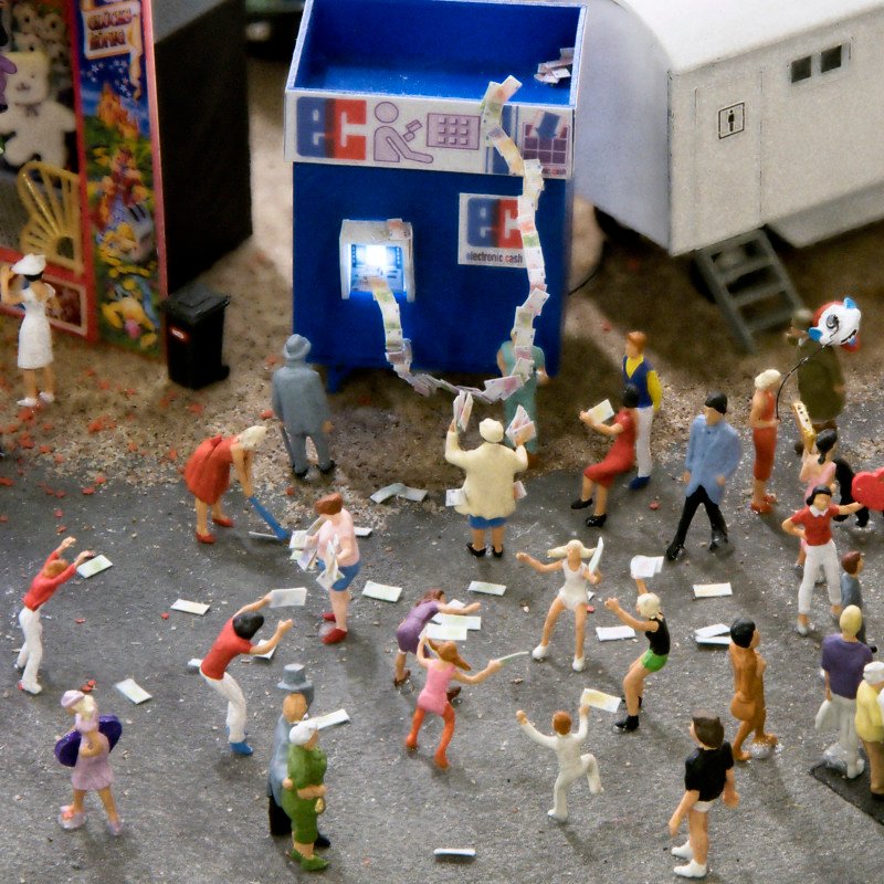 was ist eigentlich neu an der neuen Kirmes? Das Riesenrad kommt mir noch bekannt vor:Es scheint, dass noch nicht alles reibungslos funktioniert... jedenfalls halten die Gondeln mitunter den Mindestabstand nicht ein:Richtigen Abstand haben tatsächlich nur die Wohnwagen der Schausteller, denn die bruchen ihre Privatsphäre angesichts von derzeitigen Öffnungszeiten von bis zu 19 Stunden am Stück (das sind 76 MiWuLa-Tage!):Ob angesichts wilder Fahrgeschäfte in unmittelbarer Nähe an Ausruhen zu denken ist, darf man dennoch bezweifeln:Technik, die natürlich in Torstens Videos besser rüberkommt als im Standbild:Auch die Wilde Maus gab es schon auf der alten Kirmes, aber irgendwie sieht das nun alles spannender aus:Man könnte sich die Frage stellen, wie sich die kleinen Preiserleins in Zeiten der Krise einen solchen Rummelbesuch leisten können:Die Antwort liefert ein etwas übermütiger Geldautomat:Da reicht das MiWuLa-Geld sogar für endlose Autoscooter-Sessions: