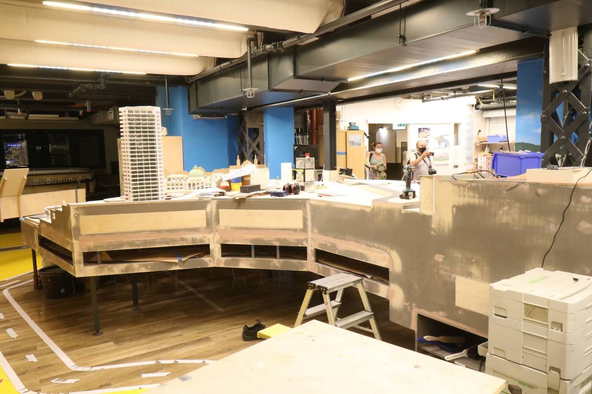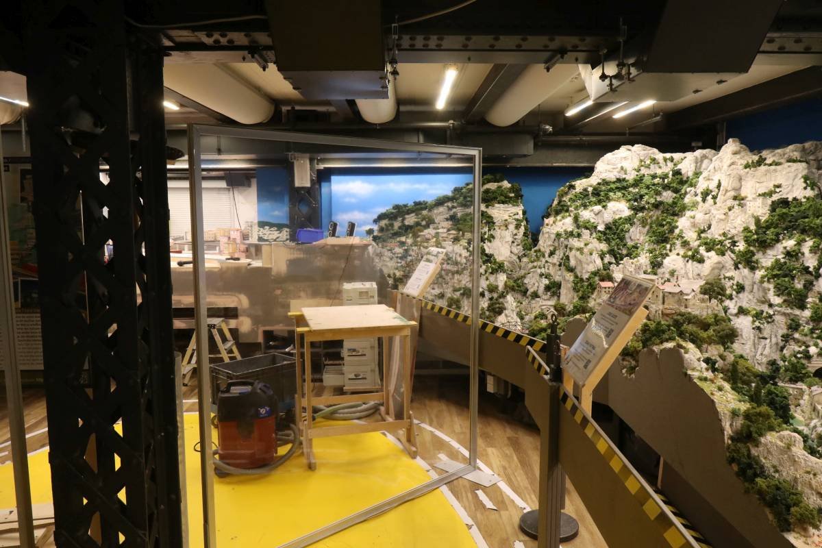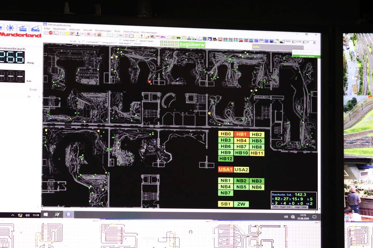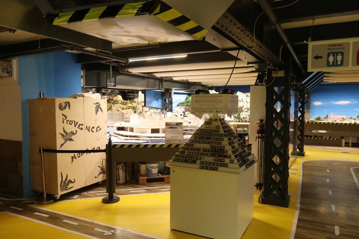 Treffpunkt ist nach wie vor der Leitstand, hier gibt es Informationen zur Computerpower des Miwulas, zur Geschichte des Leitstandumbaus und zum Ablauf der Führung, maximal 6 Personen, zwei Haushalte, keine Hunde. Mathias hat uns sehr engagiert die Fakten zum Wunderland erklärt und dabei natürlich auch die ein oder andere Anekdote einfliessen lassen. Danach ging es hinter Amerika, während des Shutdowns hat das Wunderland auch unter der Anlage eine Sprinkleranlage bekommen. Hoffentlich löst nicht ein Besucher (oder Mitarbeiter) die Anlage aus Versehen aus.
