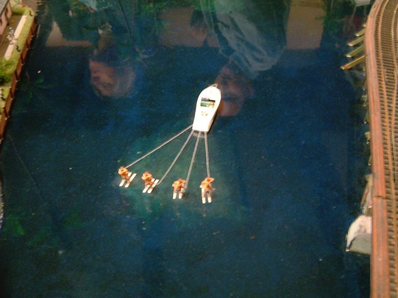 Im Laufe der Jahre wird das quellfrische Wasser gewiss etwas an Leuchtkraft verlieren (Staub und Vergilbung), so dass es bei "normalem" MiWuLa-Tageslicht mit Sicherheit dezenter erscheint. Ein Beispiel für das "erste" Wasser (muss vor ca. 15 Jahren aufgenommen worden sein). Die Wasserschiläufer und das Boot hatten gar keine Bugwelle / Heckwelle, und die Farbe war leicht bläulicher, als die meisten es heute in Erinnerung haben: