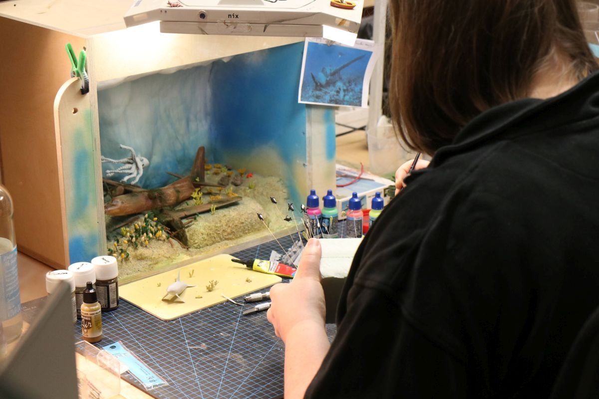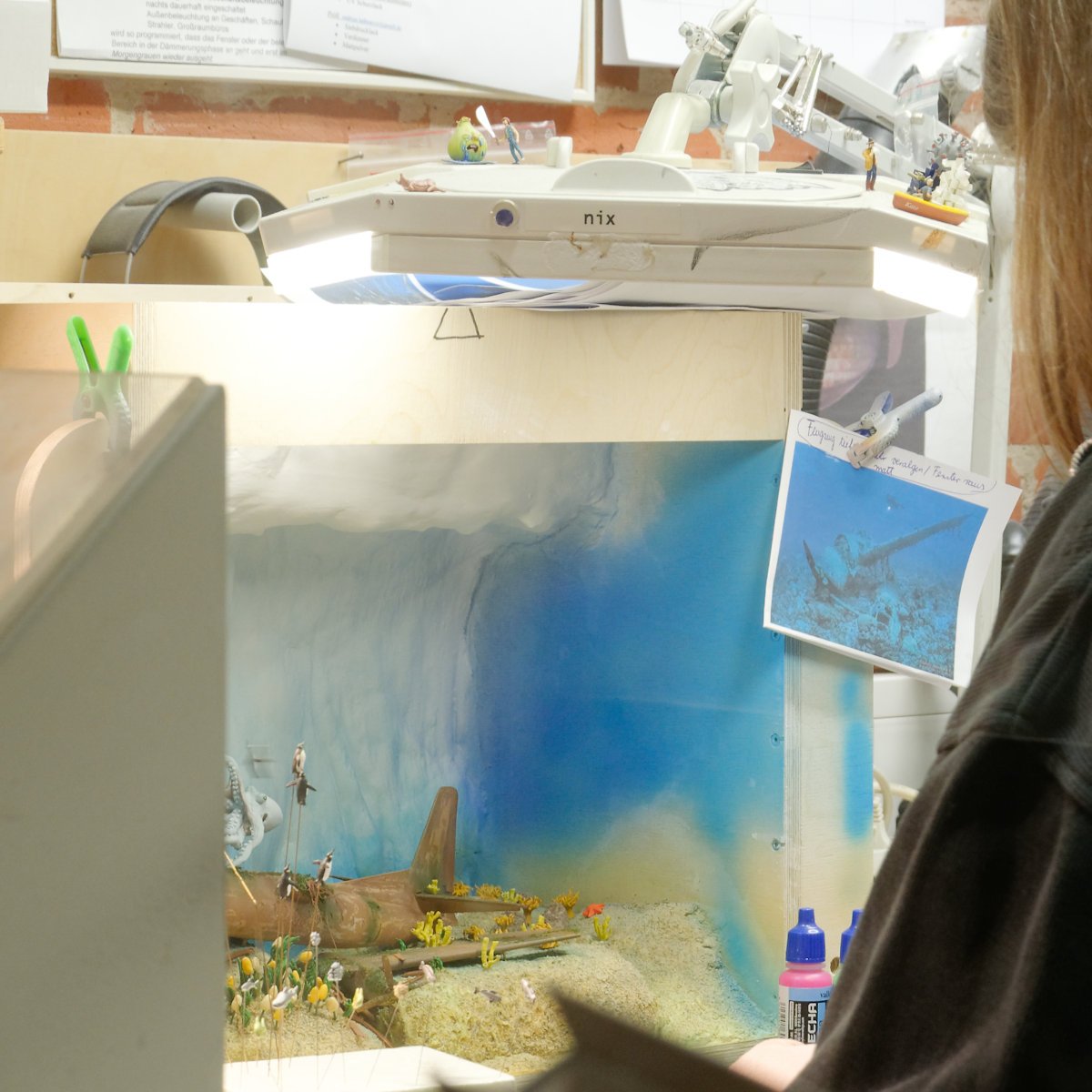 Einen interessanten Schaukasten baut Teresa da. Flugzeugwrack mit Fischschwarm.