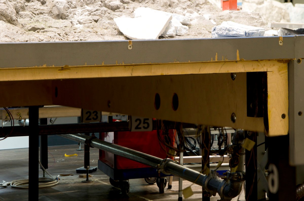 Kommen wir nun zur Drake-Passage. Die Grundlage bildet das aus den Wochenberichten bekannte Gerüst mit der Wellenmechanik. Darauf lag gestern ein dünnes Tuch. Über dem ganzen befindet sich ein Beamer, der auf das Tuch und den Hintergrund Filme projiziert.
