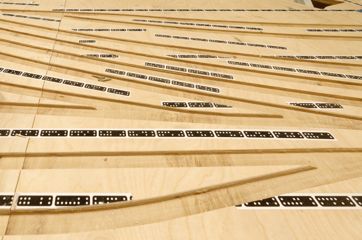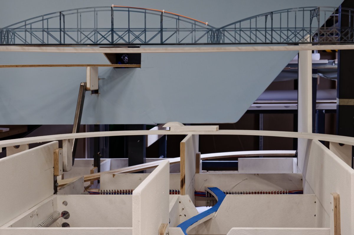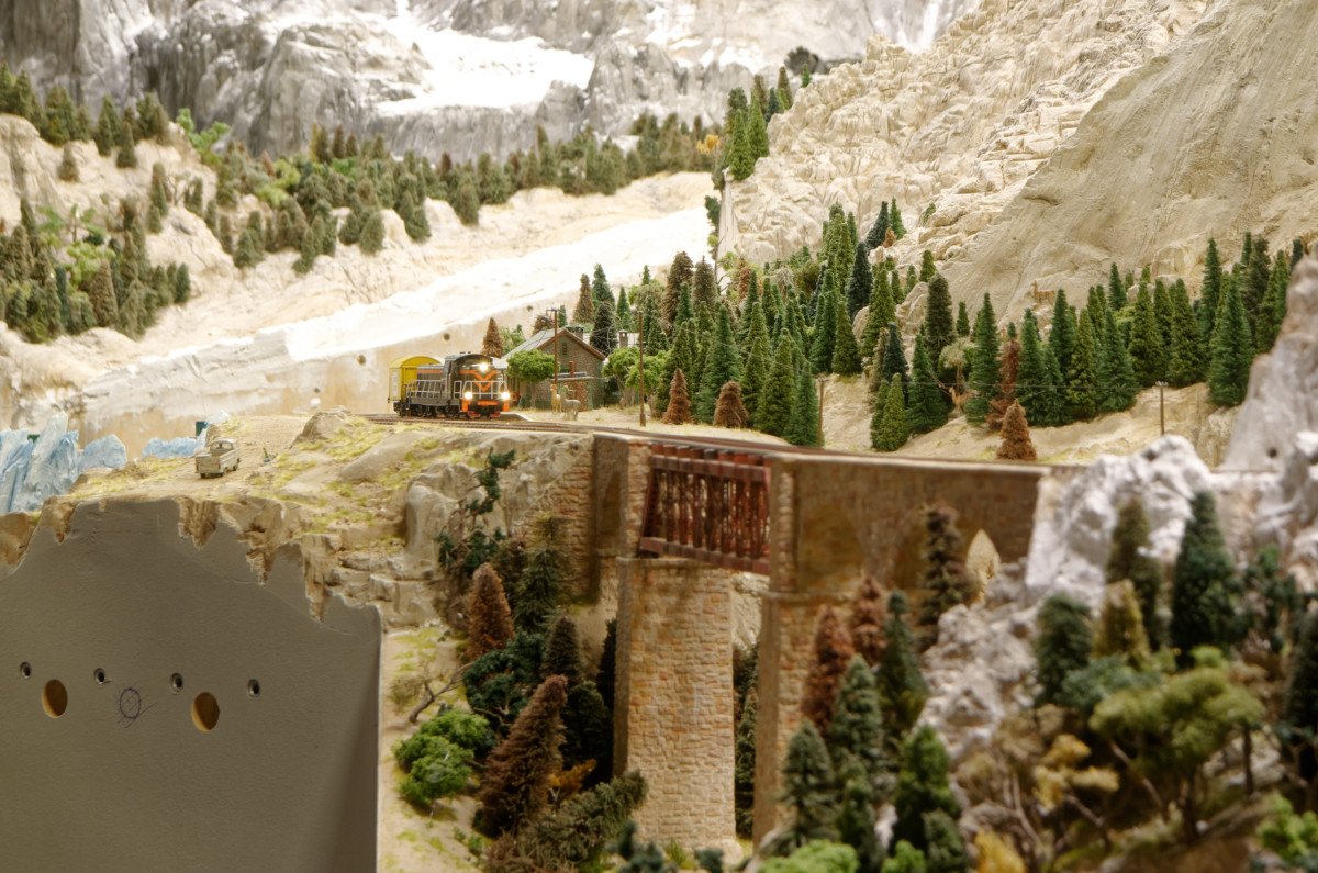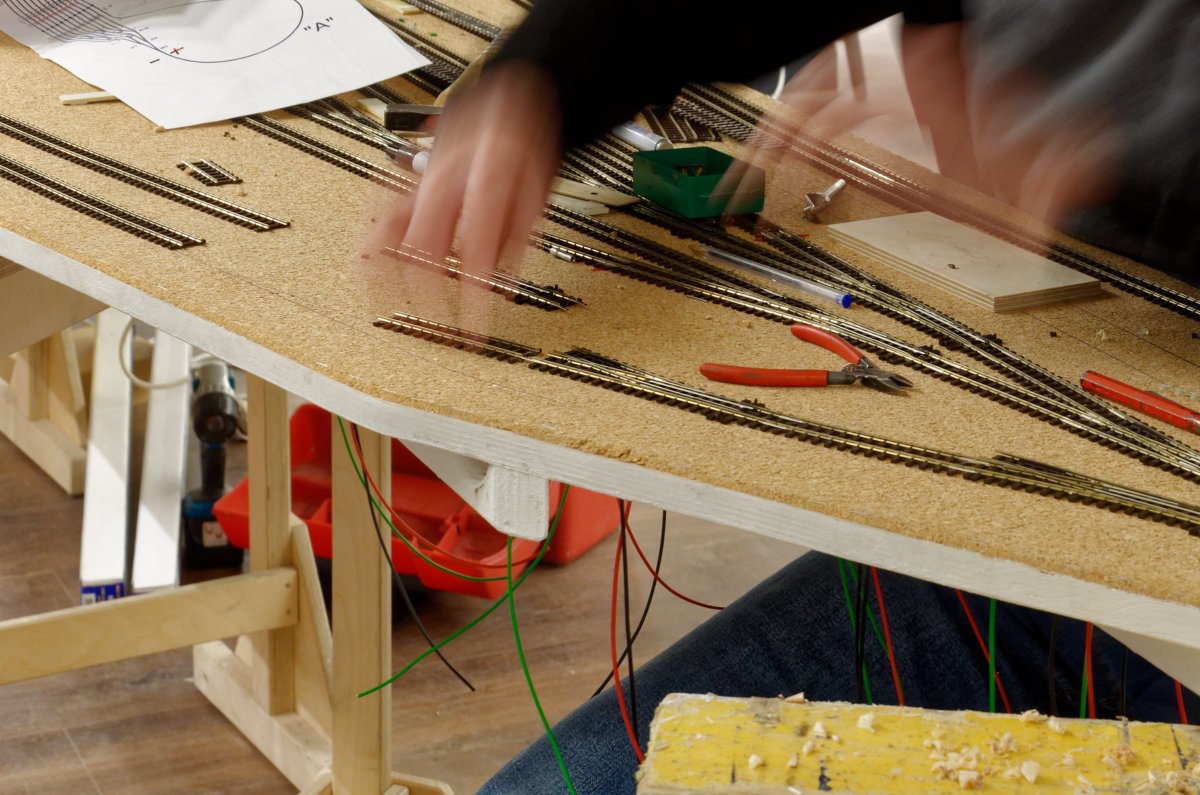 Nicht weit entfernt befindet sich die Baustelle von Atacama-Wüste und Anden...... mit etwas Schweiz-Feeling unter der Treppe:Die interessante Trassenführung sorgt für Vorfreude:Hier bohrt Wolfgang Löcher in die Schattenbahnhofsplatte......wenn er gerade keine Gleise verlegt.Auch das Dominospiel...dient dazu, dass bald passgenau Gleise verlegt werden können. Hier sind sie schon fertig...... und es fährt sogar Rollmaterial:Natürlich darf ein Brückenbild nicht fehlen:Quizfrage: Was wird da am Brückenbogen befestigt?