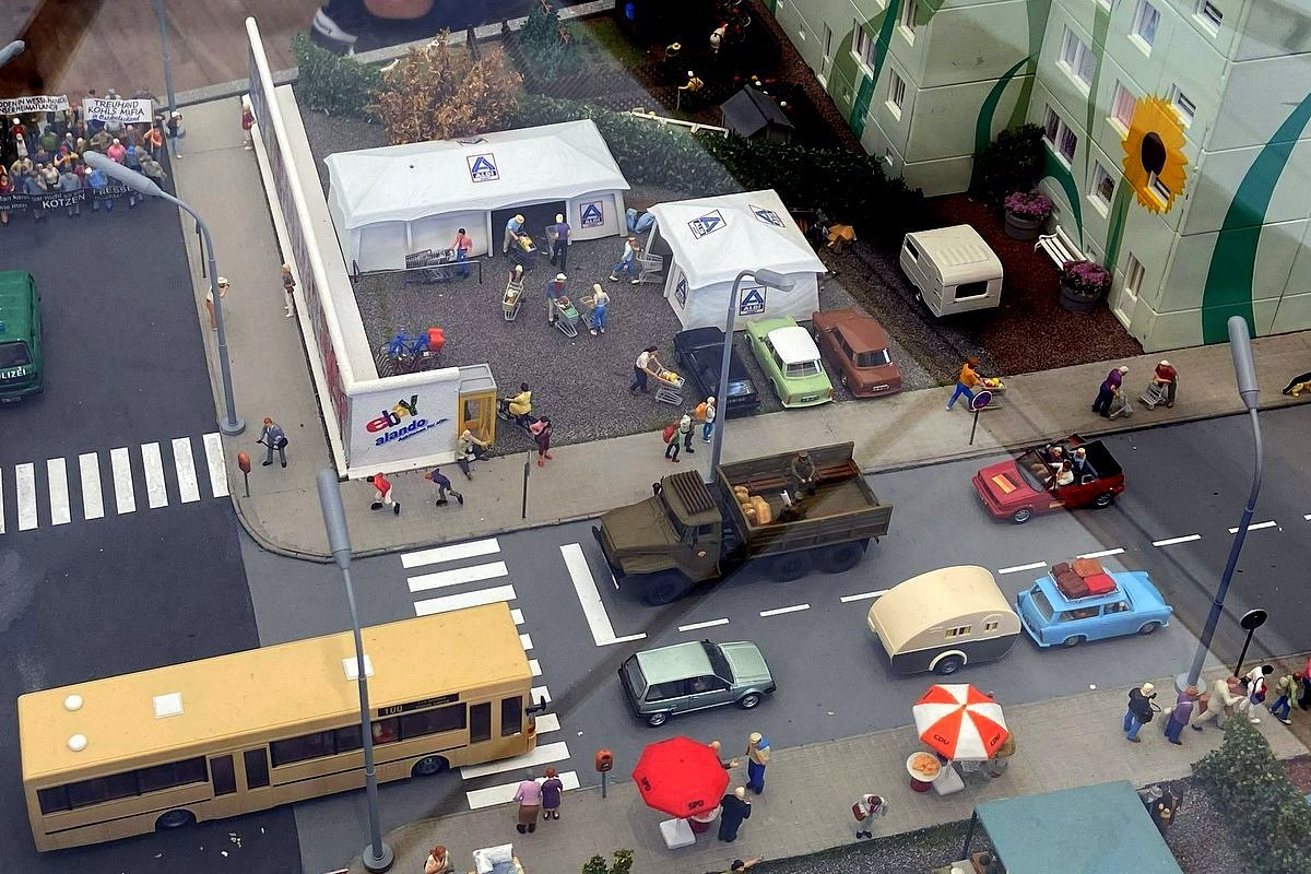 Mich hat vor allem das 90er Jahre Diorama sehr berührt. In der Wendezeit habe ich für ein paar Jahre als "Wessi" in einer großen Stadt in Sachsen Anhalt gelebt und gearbeitet. An die Supermärkte im Zelt, das Wirken der Treuhand und das langsame Verschwinden der Trabbis erinnere ich mich noch sehr gut. Damals habe ich einige Atlanten und Bücher aus einem Entsorgungscontainer vor einer Schule gefischt.Momente, die einem im Gedächtnis bleiben.
