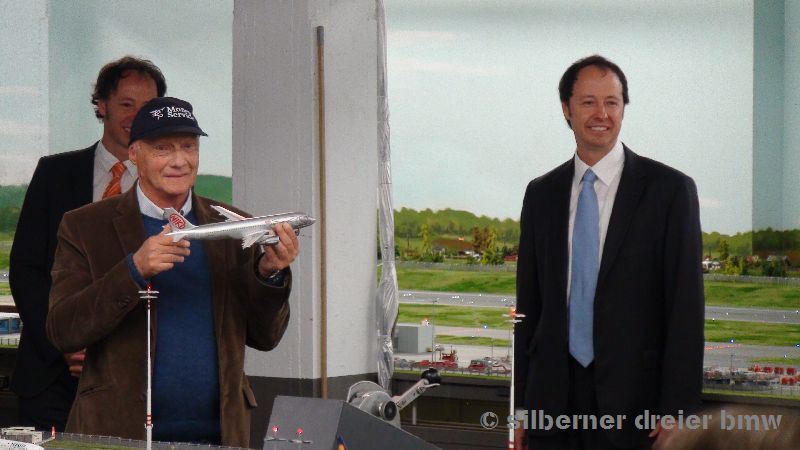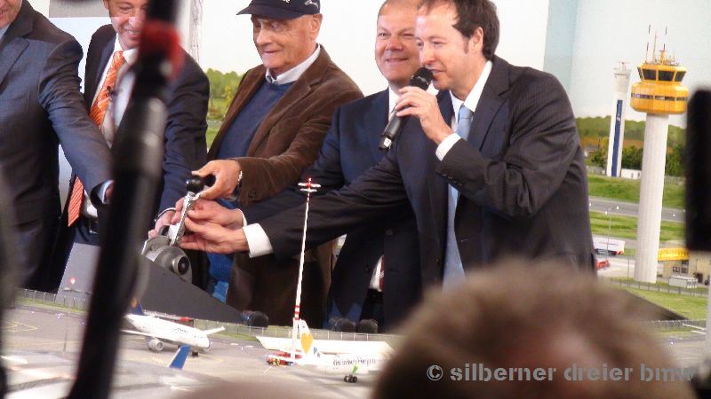 Endlich! Ein erster Blick auf den Flughafen: Der Ehrengast traf auch bald ein: Gerrit hat ihm selbstverständlich den Flughafen genauestens erklärt: Anschließend wurde ihm von Freddy und Gerrit ein Flugzeug seiner Airline NIKI überreicht. Nun aber zum eigentlichen Event. Gemeinsam wurde der Schubhelbel nach vorne geschoben und der Flughafen damit offiziell eröffnet.