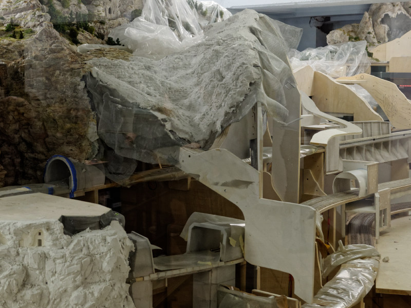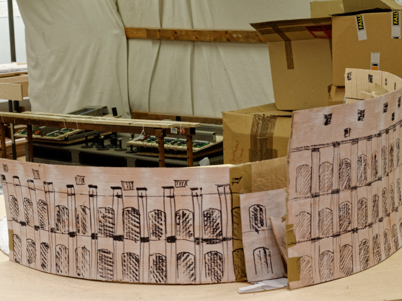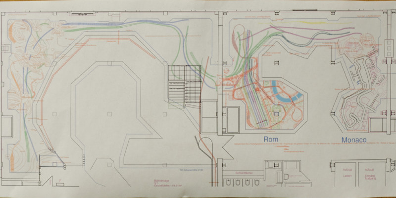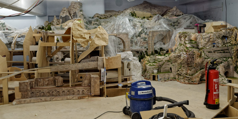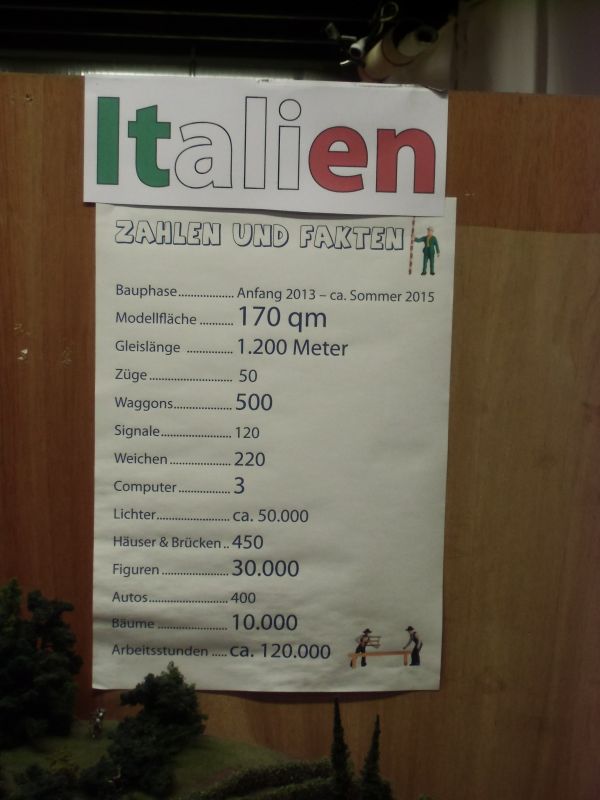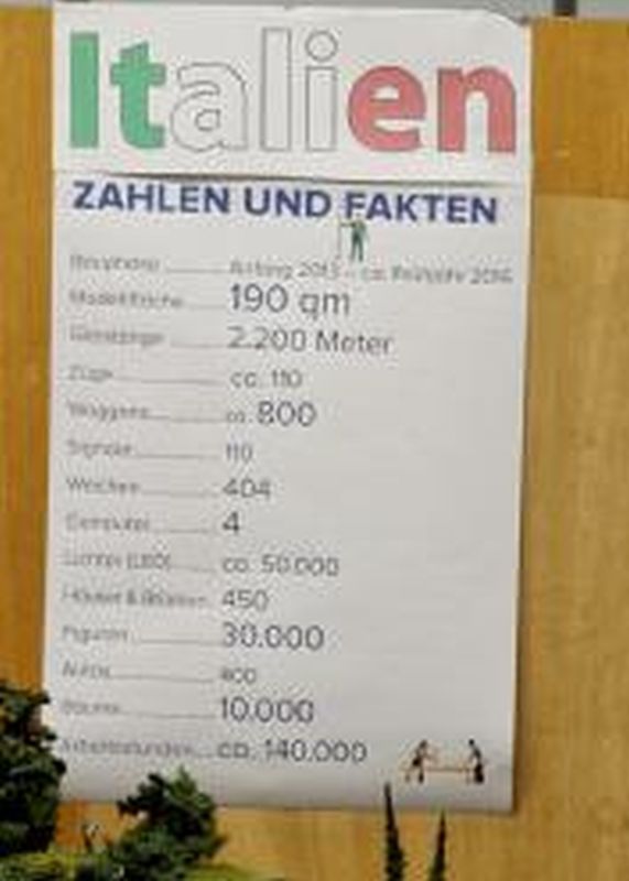 Zunächst mal ein wenig Italien-Baustelle: Eine nette Geste für die vielen nicht-Modellbahner, die noch nie Gleismaterial verlegt geschweige denn Landschaften modelliert haben und gerne wissen möchten, wie sich die vielfältigen Baustoffe anfühlen: Hier darf man ausnahmensweise auch mal selbst Hand anlegen:Etwas weiter hinten findet man nach wie vor ein großes Pappmodell, das zur Einschätzung der Größenverhältnisse dient - nicht weiter interessant, wären da nicht im Hintergrund einige Module, die zum Träumen von Knopfdruckaktionen und anderen Gimmicks im Italienabschnitt anregen. Die dort sichtbaren dicken Kabelkanäle lassen vermuten, dass man trotz besonderer Fokussierung auf die Landschaften die Technik nicht zu kurz kommen lässt.Auch das kleine Diorama stand bereits lange vor dem letzten MFM - die Aushänge dagegen sind mir zuvor noch nicht aufgefallen. Einmal Zahlen & Fakten, und einmal so etwas wie ein Gleisplan...Offenbar enthält der Plan nur die sichtbaren Strecken - dennoch (vor allem in Rom) beeindruckend komplex:Die Wände mit den Rolläden werden wohl in absehbarer Zeit Geschichte sein... auch wenn da wohl nachträglich mit Edding gemogelt wurde. Dem Team sei es verziehen... sofern die "6" nicht noch zu einer "8" umgepinselt wird.