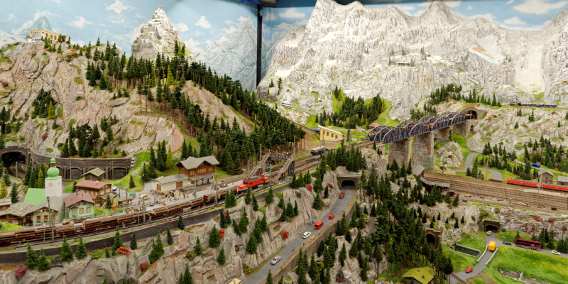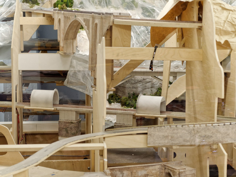 Die aufwändige Herstellung wurde bereits in Bella Italia 2.0 - Folge 8: Das Tunnelportal beschrieben:Soviel zum Bauabschnitt Italien. Ein anderes Thema meines letzten Besuchs war die Frage nach der Zahl der Brücken im MiWuLa, die sich scheinbar nur durch eine möglichst exakte Zählung erfassen lässt. Eigentlich ganz einfach?Naja, jede Brücke einmal fotografieren, dann zusammenzählen und fertig. Oder etwa nicht? Ziemlich schnell musste ich mir die Frage stellen, was denn eigentlich als Brücke zählt. Die Personenüberführung am Bahnhof von St. Christian (links) ganz bestimmt. Auch im Hintergund gibt es 2-3 Brücken, die man zweifelsfrei als solche einstufen kann. Schwieriger wird es dann schon bei der Unterführung der Strasse unter dem Bahnhof von St. Wendel (rechts im Bild). Und kurz davor führt die Strasse über ein Rohr, das den Lauf eines Bachs ermöglicht (unten rechts). Ist das nun auch eine Brücke? Können Strassentunnel unter Gleisen mitzählen, bei denen nicht klar ist, ob sie einen Ausgang haben? Werden mehrfache Untertunnelungen eines Bahndamms (im folgenden Bild im Hintergrund) einzeln als Brücken gezählt? Was ist mit den Förderanlagen, werden auch dort Brücken gezählt? Falls ja, wie viele?Ich habe am 17.03. schätzungsweise 80%-90% der Brücken in Österreich, Knuffingen und Mitteldeutschland ablichten können. Die Auswertung werde ich bis zum MFM 2025 sicherlich teilweise hinbekommen.