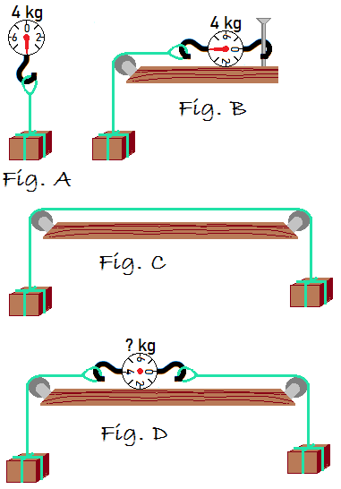 Fig B zeigt, es ziehen 4 kg an der Waage.