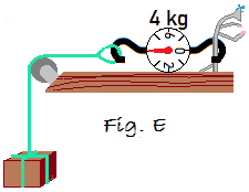 Daran ändert sich auch nichts, wenn wir den Backstein über eine Rolle am Tisch herunterhängen lassen und die Waage auf dem Tisch fixieren. Fig. B