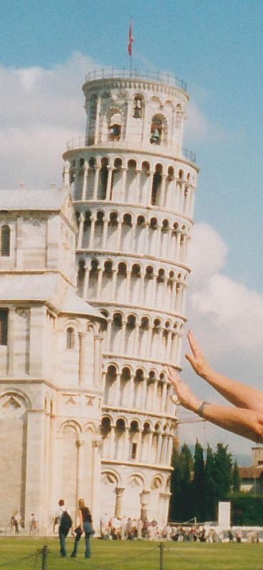 Er will eine überdimensionale hohe Torte in Form des Pisa Turms zu sich ziehen. Oder sind es aufeinander gestapelte Pizzen die durch Säulen zusammen gehalten werden?